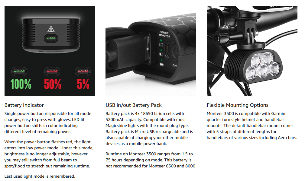 - 【Magicshine's 3500 Lumen Mountain Bike Light 】 The Monteer 3500S is capable of 3500 lumens of max actual output. 5200mAh super high capacity battery pack. One of our brightest most powerful bike headlights.